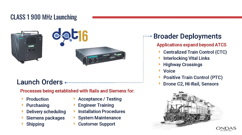 CLASS 1 900 M Hz Launching Launch Orders Processes being established with Rails and Siemens for: Broader Deployments Applications expand beyond ATCS Centralized Train Control (CTC) Interlocking Vital Links Highway Crossings Voice Positive Train Control (PTC) Drone C2, Hi - Rail, Sensors Production Purchasing D eli very s c heduli n g Siemens packages Shipping Acceptance / Testing Engineer Training Installation Procedures System Maintenance Customer Support