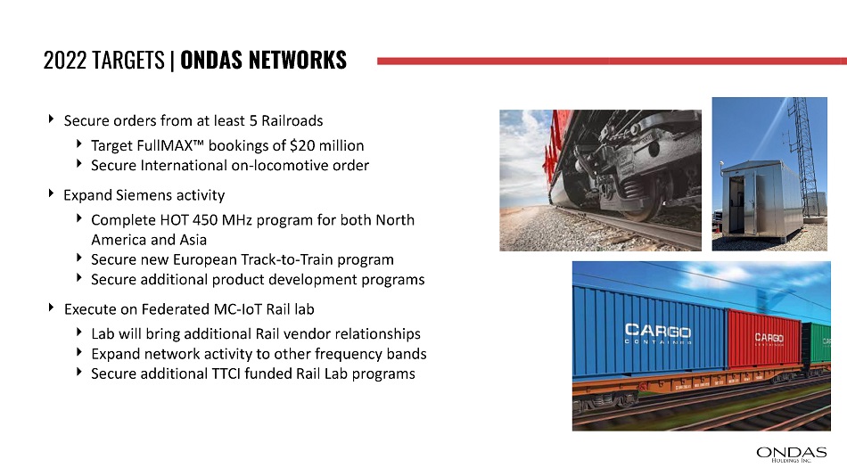 2022 TARGE T S | ONDAS NETWOR K S Secure orders from at least 5 Railroads Target FullMAX Ρ bookings of $20 million America and Asia Secure International on - locomotive order Expand Siemens activity Complete HOT 450 MHz program for both North Secure new European Track - to - Train program Secure additional product development programs Execute on Federated MC - IoT Rail lab Lab will bring additional Rail vendor relationships Expand network activity to other frequency bands Secure additional TTCI funded Rail Lab programs