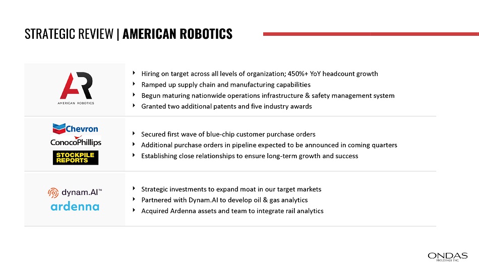 STRATE GIC RE V IEW | AMERICA N ROBOTICS Hiring on target across all levels of organization; 450%+ YoY headcount growth Ramped up supply chain and manufacturing capabilities Begun maturing nationwide operations infrastructure & safety management system Granted two additional patents and five industry awards Secured first wave of blue - chip customer purchase orders Additional purchase orders in pipeline expected to be announced in coming quarters Establishing close relationships to ensure long - term growth and success Strategic investments to expand moat in our target markets Partnered with Dynam.AI to develop oil & gas analytics Acquired Ardenna assets and team to integrate rail analytics