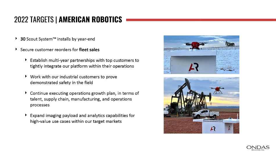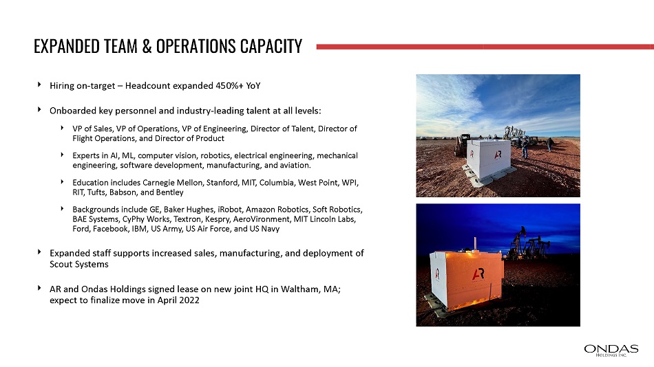 EXPAN D ED TE A M & OPER A TIONS CAP A CITY Hiring on - target – Headcount expanded 450%+ YoY Onboarded key personnel and industry - leading talent at all levels: Experts in AI, ML, computer vision, robotics, electrical engineering, mechanical engineering, software development, manufacturing, and aviation. Education includes Carnegie Mellon, Stanford, MIT, Columbia, West Point, WPI, RIT, Tufts, Babson, and Bentley VP of Sales, VP of Operations, VP of Engineering, Director of Talent, Director of Flight Operations, and Director of Product Backgrounds include GE, Baker Hughes, iRobot, Amazon Robotics, Soft Robotics, BAE Systems, CyPhy Works, Textron, Kespry, AeroVironment, MIT Lincoln Labs, Ford, Facebook, IBM, US Army, US Air Force, and US Navy Expanded staff supports increased sales, manufacturing, and deployment of Scout Systems AR and Ondas Holdings signed lease on new joint HQ in Waltham, MA; expect to finalize move in April 2022