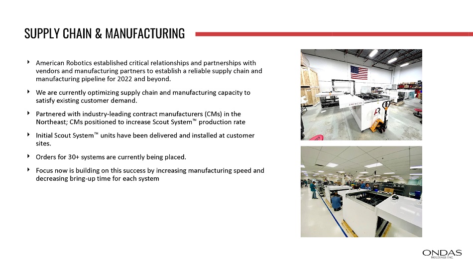 SUPP L Y CHAIN & M A NUFACTUR I NG American Robotics established critical relationships and partnerships with vendors and manufacturing partners to establish a reliable supply chain and manufacturing pipeline for 2022 and beyond. We are currently optimizing supply chain and manufacturing capacity to satisfy existing customer demand. Partnered with industry - leading contract manufacturers (CMs) in the Northeast; CMs positioned to increase Scout System production rate Initial Scout System units have been delivered and installed at customer sites. Orders for 30+ systems are currently being placed. Focus now is building on this success by increasing manufacturing speed and decreasing bring - up time for each system
