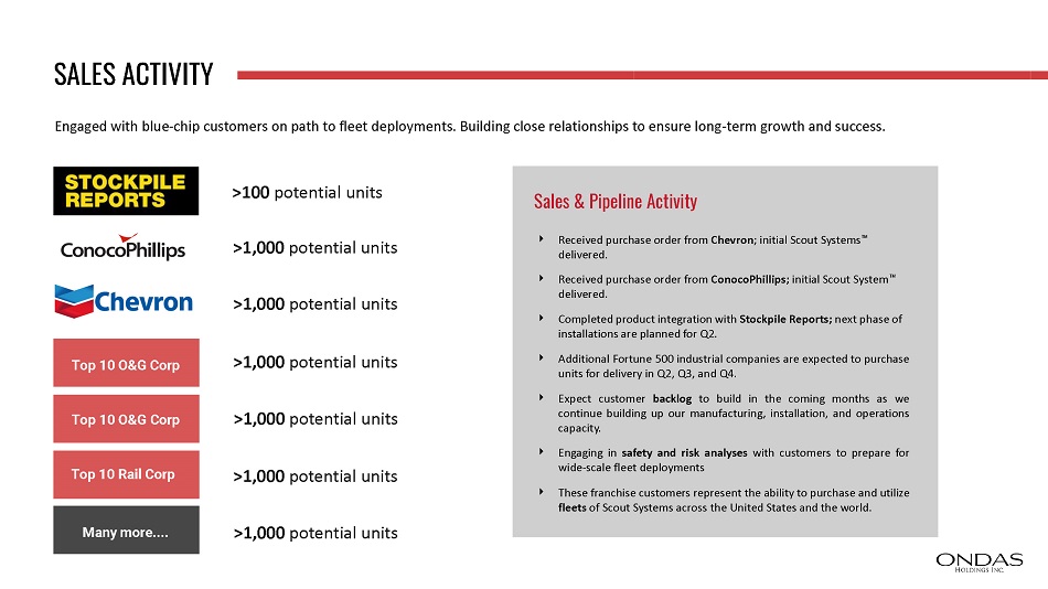 SALES ACT I VITY Engaged with blue - chip customers on path to fleet deployments. Building close relationships to ensure long - term growth and success. Received purchase order from Chevron ; initial Scout Systems delivered. Received purchase order from ConocoPhillips; initial Scout System delivered. Completed product integration with Stockpile Reports; next phase of installations are planned for Q2. Additional Fortune 500 industrial companies are expected to purchase units for delivery in Q2, Q3, and Q4. Expect customer backlog to build in the coming months as we continue building up our manufacturing, installation, and operations capacity . Engaging in safety and risk analyses with customers to prepare for wide - scale fleet deployments These franchise customers represent the ability to purchase and utilize fleets of Scout Systems across the United States and the world. Sales & Pipeline Activity Top 10 O& G Corp Top 10 O& G Corp Many mor e . . .. >100 potential units >1,000 potential units >1,000 potential units >1,000 potential units >1,000 potential units >1,000 potential units >1,000 potential units Top 10 Ra il Corp