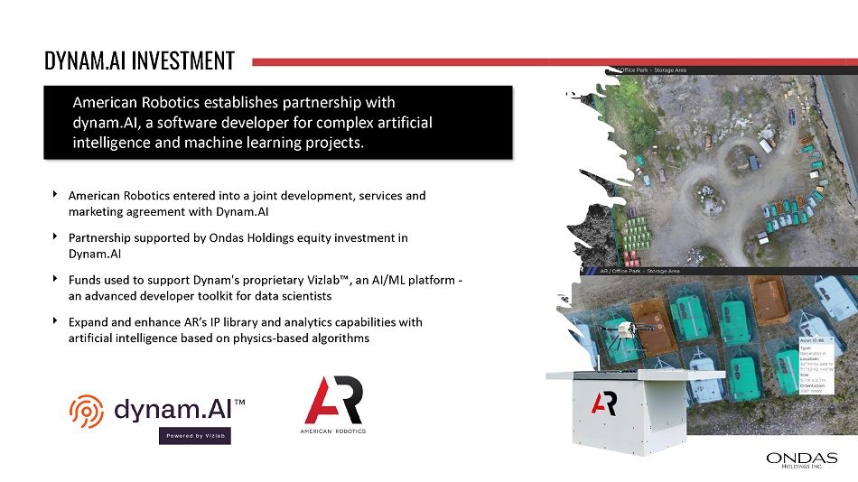 DYN A M.AI INV E STME N T American Robotics entered into a joint development, services and marketing agreement with Dynam.AI Partnership supported by Ondas Holdings equity investment in Dynam.AI Funds used to support Dynam's proprietary Vizlab Ρ , an AI/ML platform - an advanced developer toolkit for data scientists Expand and enhance AR’s IP library and analytics capabilities with artificial intelligence based on physics - based algorithms American Robotics establishes partnership with dynam.AI, a software developer for complex artificial intelligence and machine learning projects.