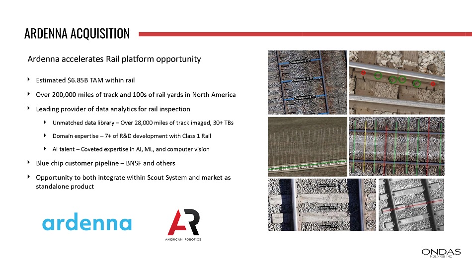 ARD EN N A AC Q UISITION Over 200,000 miles of track and 100s of rail yards in North America Estimated $6.85B TAM within rail Leading provider of data analytics for rail inspection Domain expertise – 7+ of R&D development with Class 1 Rail Unmatched data library – Over 28,000 miles of track imaged, 30+ TBs AI talent – Coveted expertise in AI, ML, and computer vision Blue chip customer pipeline – BNSF and others Opportunity to both integrate within Scout System and market as standalone product Ardenna accelerates Rail platform opportunity