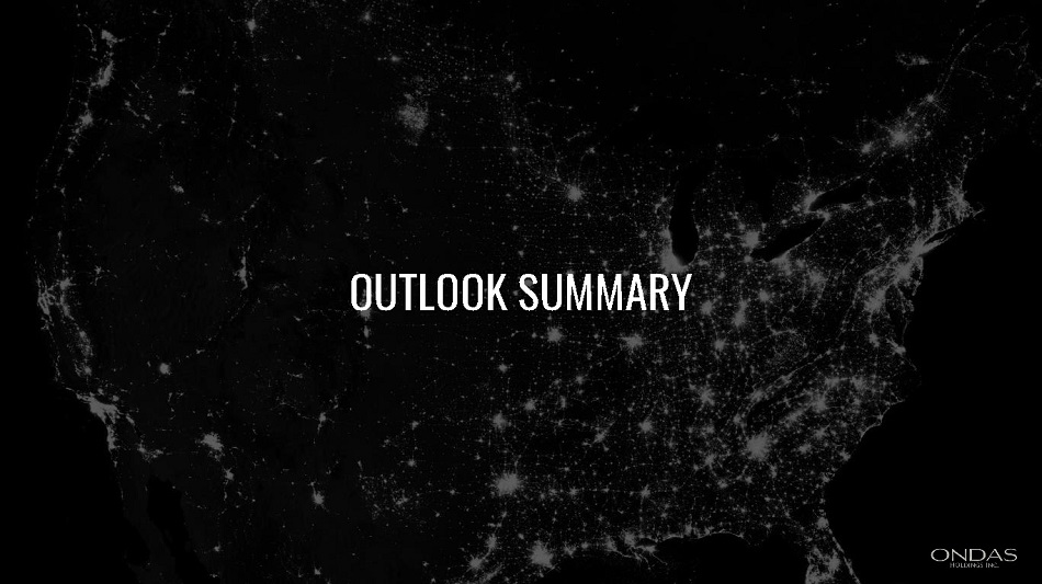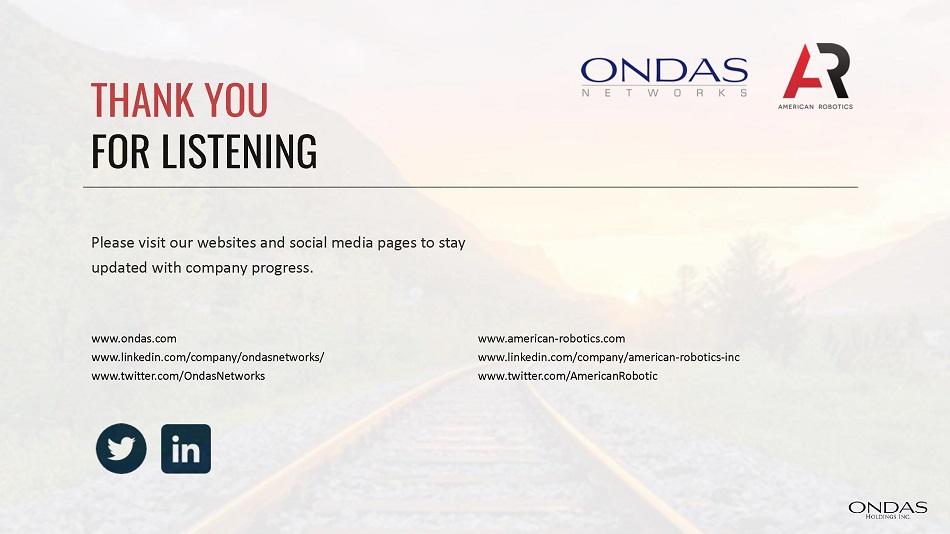 THAN K YOU FO R LISTENING ONDAS N E T W O R K S J - l AMERICAN ROBO TICS Please visit our websites and social media pages to stay updated with company progress. www.ondas.com www.linkedin.com/company/ondasnetworks/ www.twitter.com/OndasNetworks www.american - robotics.com www.linkedin.com/company/american - robotics - inc www.twitter.com/AmericanRobotic 0 ONDAS HOLDIN GS IN C.