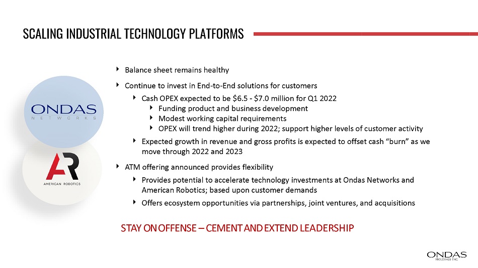 SCA L ING IN D US TRIAL TECHNOL O GY PLATFORMS Balance sheet remains healthy Continue to invest in End - to - End solutions for customers Cash OPEX expected to be $6.5 - $7.0 million for Q1 2022 Funding product and business development Modest working capital requirements OPEX will trend higher during 2022; support higher levels of customer activity Expected growth in revenue and gross profits is expected to offset cash “burn” as we move through 2022 and 2023 ATM offering announced provides flexibility Provides potential to accelerate technology investments at Ondas Networks and American Robotics; based upon customer demands Offers ecosystem opportunities via partnerships, joint ventures, and acquisitions S T A Y O N O FF E N S E – CE M E N T A N D E X T E N D L E AD E R S H I P