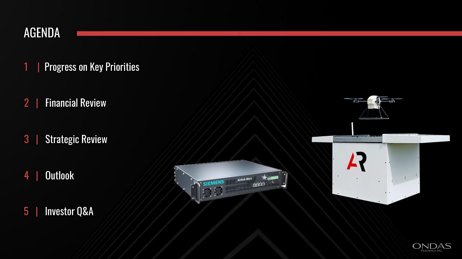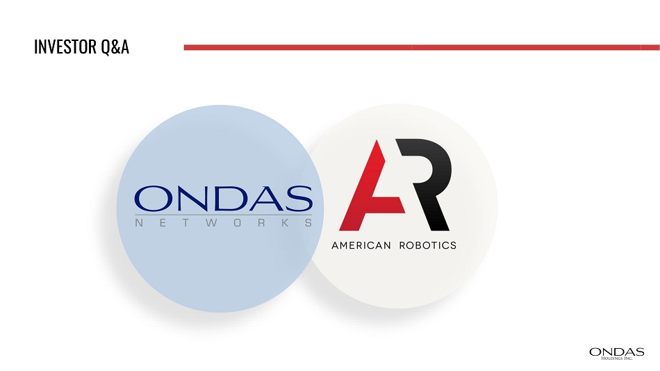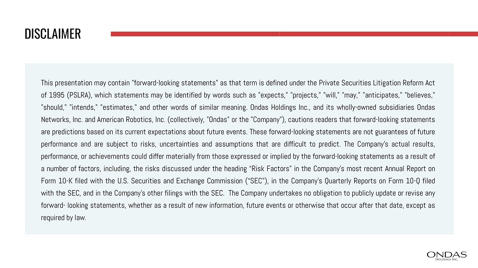 DISCLAIMER This presentation may contain "forward - looking statements" as that term is defined under the Private Securities Litigation Reform Act of 1995 (PSLRA), which statements may be identified by words such as "expects," "projects," "will," "may," "anticipates," "believes," "should," "intends," "estimates," and other words of similar meaning . Ondas Holdings Inc . , and its wholly - owned subsidiaries Ondas Networks, Inc . and American Robotics, Inc . (collectively, "Ondas" or the "Company"), cautions readers that forward - looking statements are predictions based on its current expectations about future events . These forward - looking statements are not guarantees of future performance and are subject to risks, uncertainties and assumptions that are difficult to predict . The Company’s actual results, performance, or achievements could differ materially from those expressed or implied by the forward - looking statements as a result of a number of factors, including, the risks discussed under the heading “Risk Factors” in the Company’s most recent Annual Report on Form 10 - K filed with the U . S . Securities and Exchange Commission (“SEC”), in the Company’s Quarterly Reports on Form 10 - Q filed with the SEC, and in the Company’s other filings with the SEC . The Company undertakes no obligation to publicly update or revise any forward - looking statements, whether as a result of new information, future events or otherwise that occur after that date, except as required by law .