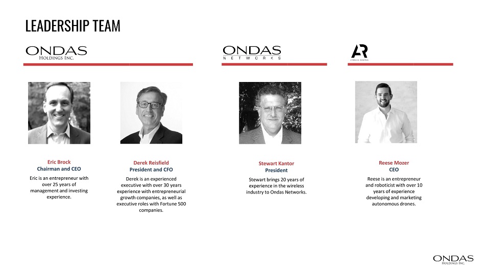 LEADERSHIP TEAM Derek Reisfield President and CFO Derek is an experienced executive with over 30 years experience with entrepreneurial growth companies, as well as executive roles with Fortune 500 companies. Eric Brock Chairman and CEO Eric is an entrepreneur with over 25 years of management and investing experience. Reese Mozer CEO Reese is an entrepreneur and roboticist with over 10 years of experience developing and marketing autonomous drones. Stewart Kantor President Stewart brings 20 years of experience in the wireless industry to Ondas Networks .