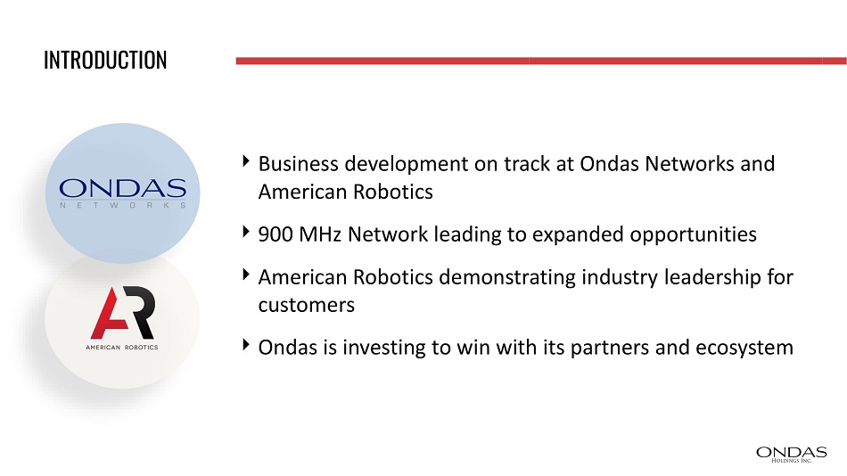 INTRODUCTION Business development on track at Ondas Networks and American Robotics 900 MHz Network leading to expanded opportunities American Robotics demonstrating industry leadership for customers Ondas is investing to win with its partners and ecosystem