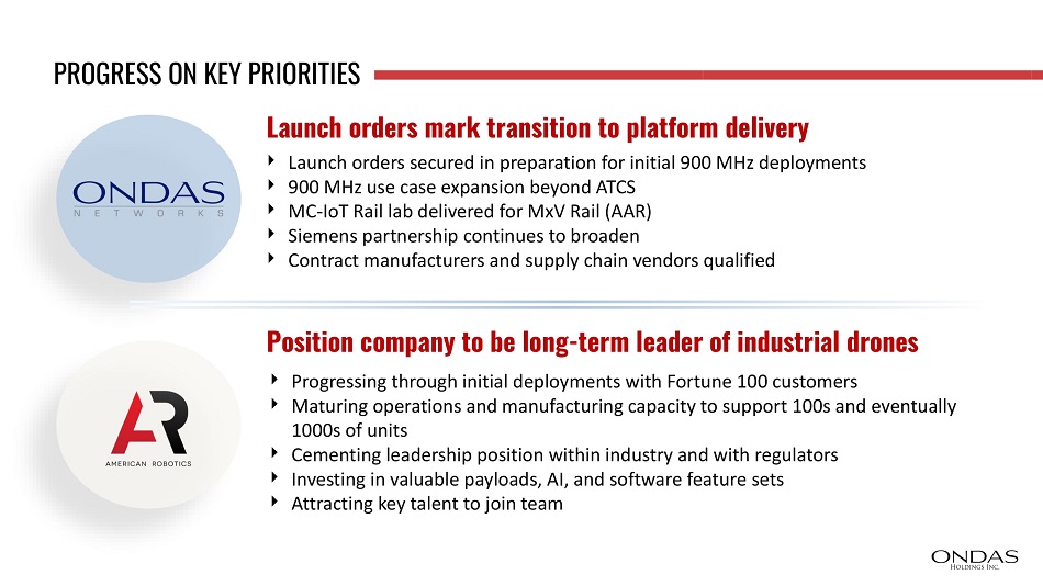 PROGRESS ON KEY PRIORITIES Launch orders mark transition to platform delivery Launch orders secured in preparation for initial 900 MHz deployments 900 MHz use case expansion beyond ATCS MC - IoT Rail lab delivered for MxV Rail (AAR) Siemens partnership continues to broaden Contract manufacturers and supply chain vendors qualified 1000s of units Position company to be long - term leader of industrial drones Progressing through initial deployments with Fortune 100 customers Maturing operations and manufacturing capacity to support 100s and eventually Cementing leadership position within industry and with regulators Investing in valuable payloads, AI, and software feature sets Attracting key talent to join team