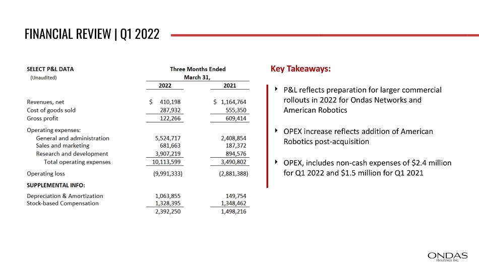 FINANCIAL REVIEW | Q1 2022 Key Takeaways: P&L reflects preparation for larger commercial rollouts in 2022 for Ondas Networks and American Robotics OPEX increase reflects addition of American Robotics post - acquisition OPEX, includes non - cash expenses of $2.4 million for Q1 2022 and $1.5 million for Q1 2021