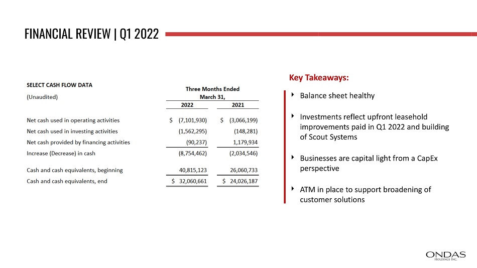 FINANCIAL REVIEW | Q1 2022 Balance sheet healthy Investments reflect upfront leasehold improvements paid in Q1 2022 and building of Scout Systems Businesses are capital light from a CapEx perspective ATM in place to support broadening of customer solutions Key Takeaways: