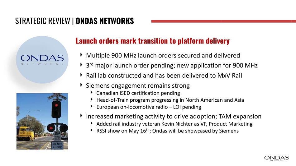 Canadian ISED certification pending Head - of - Train program progressing in North American and Asia European on - locomotive radio – LOI pending Increased marketing activity to drive adoption; TAM expansion Added rail industry veteran Kevin Nichter as VP, Product Marketing RSSI show on May 16 th ; Ondas will be showcased by Siemens STRATEGIC REVIEW | ONDAS NETWORKS Launch orders mark transition to platform delivery Multiple 900 MHz launch orders secured and delivered 3 rd major launch order pending; new application for 900 MHz Rail lab constructed and has been delivered to MxV Rail Siemens engagement remains strong