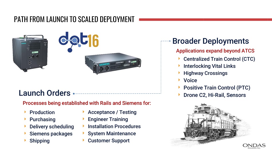 Launch Orders Processes being established with Rails and Siemens for: Broader Deployments Applications expand beyond ATCS Centralized Train Control (CTC) Interlocking Vital Links Highway Crossings Voice Positive Train Control (PTC) Drone C2, Hi - Rail, Sensors Production Purchasing Delivery scheduling Siemens packages Shipping Acceptance / Testing Engineer Training Installation Procedures System Maintenance Customer Support PATH FROM LAUNCH TO SCALED DEPLOYMENT