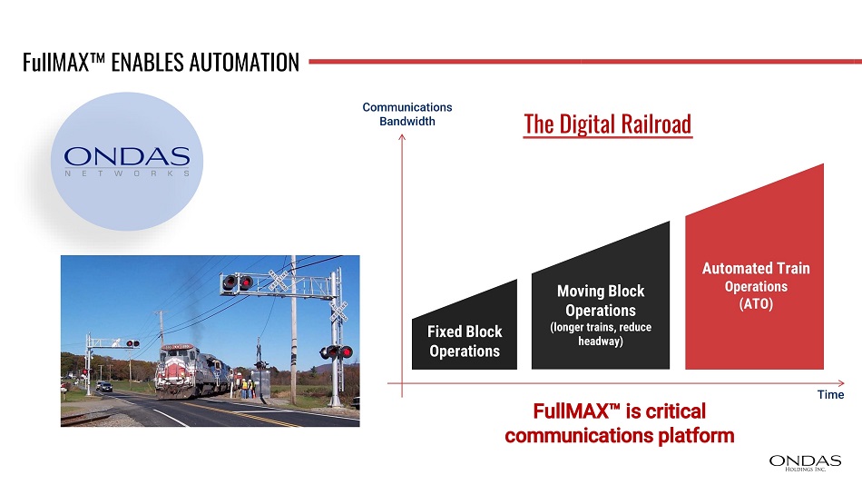 FullMAX ENABLES AUTOMATION FullMAX is critical communications platform The Digital Railroad Fixed Block Operations Moving Block Operations (longer trains, reduce headway) Automated Train Operations (ATO) Time Communications Bandwidth