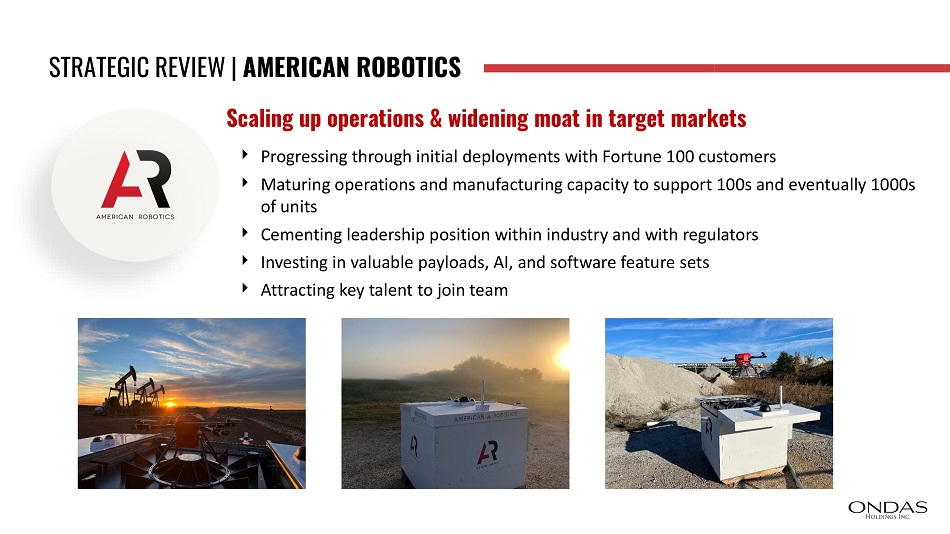 STRATEGIC REVIEW | AMERICAN ROBOTICS Scaling up operations & widening moat in target markets Progressing through initial deployments with Fortune 100 customers Maturing operations and manufacturing capacity to support 100s and eventually 1000s of units Cementing leadership position within industry and with regulators Investing in valuable payloads, AI, and software feature sets Attracting key talent to join team