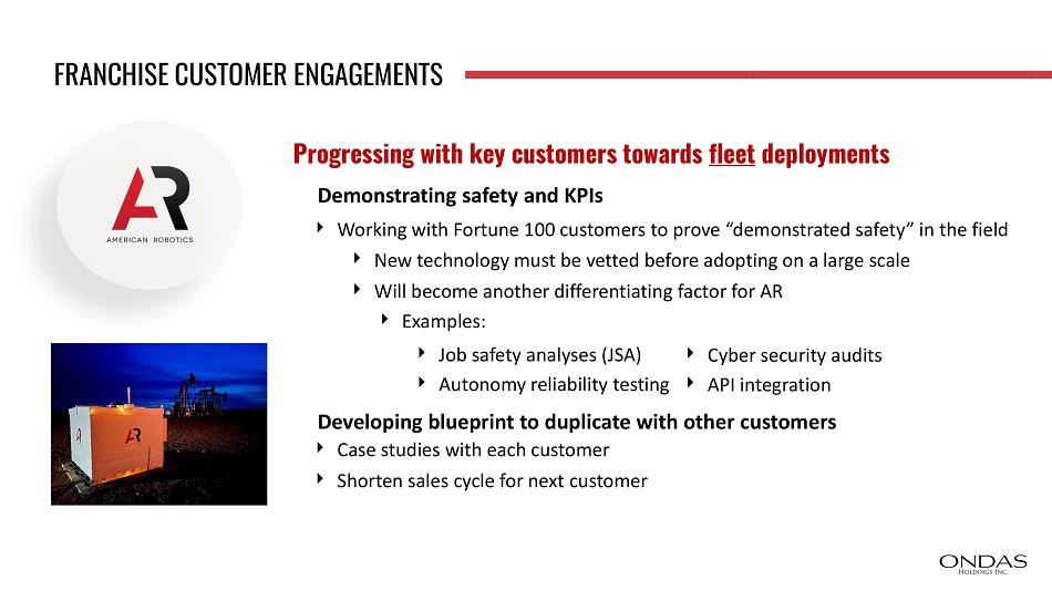 FRANCHISE CUSTOMER ENGAGEMENTS Progressing with key customers towards fleet deployments Demonstrating safety and KPIs Working with Fortune 100 customers to prove “demonstrated safety” in the field New technology must be vetted before adopting on a large scale Will become another differentiating factor for AR Examples: Job safety analyses (JSA) Autonomy reliability testing Cyber security audits API integration Developing blueprint to duplicate with other customers Case studies with each customer Shorten sales cycle for next customer