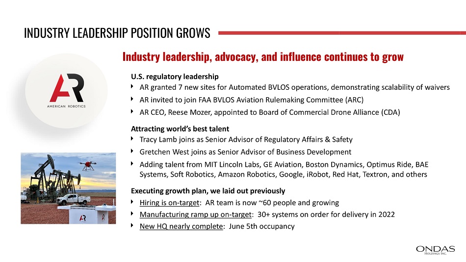 INDUSTRY LEADERSHIP POSITION GROWS U.S. regulatory leadership AR granted 7 new sites for Automated BVLOS operations, demonstrating scalability of waivers AR invited to join FAA BVLOS Aviation Rulemaking Committee (ARC) AR CEO, Reese Mozer, appointed to Board of Commercial Drone Alliance (CDA) Attracting world’s best talent Tracy Lamb joins as Senior Advisor of Regulatory Affairs & Safety Gretchen West joins as Senior Advisor of Business Development Adding talent from MIT Lincoln Labs, GE Aviation, Boston Dynamics, Optimus Ride, BAE Systems, Soft Robotics, Amazon Robotics, Google, iRobot, Red Hat, Textron, and others Executing growth plan, we laid out previously Hiring is on - target : AR team is now ~60 people and growing Manufacturing ramp up on - target : 30+ systems on order for delivery in 2022 New HQ nearly complete : June 5th occupancy Industry leadership, advocacy, and influence continues to grow