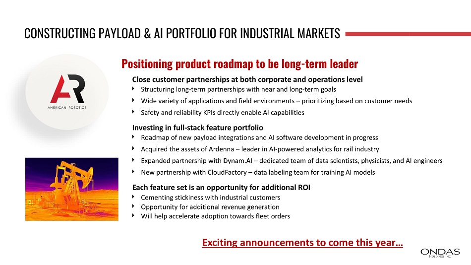 CONSTRUCTING PAYLOAD & AI PORTFOLIO FOR INDUSTRIAL MARKETS Close customer partnerships at both corporate and operations level Structuring long - term partnerships with near and long - term goals Wide variety of applications and field environments – prioritizing based on customer needs Safety and reliability KPIs directly enable AI capabilities Investing in full - stack feature portfolio Roadmap of new payload integrations and AI software development in progress Acquired the assets of Ardenna – leader in AI - powered analytics for rail industry Expanded partnership with Dynam.AI – dedicated team of data scientists, physicists, and AI engineers New partnership with CloudFactory – data labeling team for training AI models Each feature set is an opportunity for additional ROI Cementing stickiness with industrial customers Opportunity for additional revenue generation Will help accelerate adoption towards fleet orders Exciting announcements to come this year… Positioning product roadmap to be long - term leader