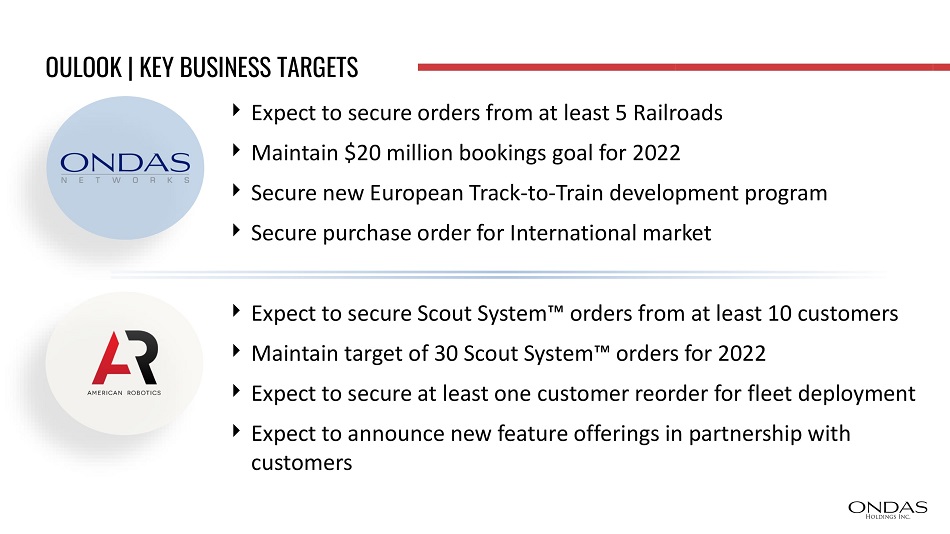 OULOOK | KEY BUSINESS TARGETS Expect to secure orders from at least 5 Railroads Maintain $20 million bookings goal for 2022 Secure new European Track - to - Train development program Secure purchase order for International market Expect to secure Scout System Ρ orders from at least 10 customers Maintain target of 30 Scout System Ρ orders for 2022 Expect to secure at least one customer reorder for fleet deployment Expect to announce new feature offerings in partnership with customers