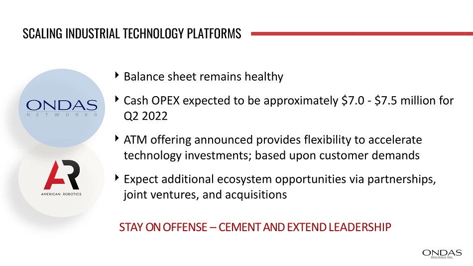 SCALING INDUSTRIAL TECHNOLOGY PLATFORMS Balance sheet remains healthy Cash OPEX expected to be approximately $7.0 - $7.5 million for Q2 2022 ATM offering announced provides flexibility to accelerate technology investments; based upon customer demands Expect additional ecosystem opportunities via partnerships, joint ventures, and acquisitions STAY ON OFFENSE – CEMENT AND EXTEND LEADERSHIP