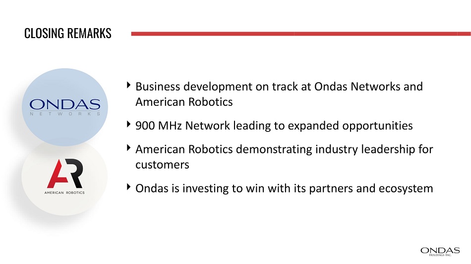 CLOSING REMARKS Business development on track at Ondas Networks and American Robotics 900 MHz Network leading to expanded opportunities American Robotics demonstrating industry leadership for customers Ondas is investing to win with its partners and ecosystem