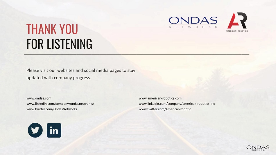 Please visit our websites and social media pages to stay updated with company progress. THANK YOU FOR LISTENING www.ondas.com www.linkedin.com/company/ondasnetworks/ www.twitter.com/OndasNetworks www.american - robotics.com www.linkedin.com/company/american - robotics - inc www.twitter.com/AmericanRobotic