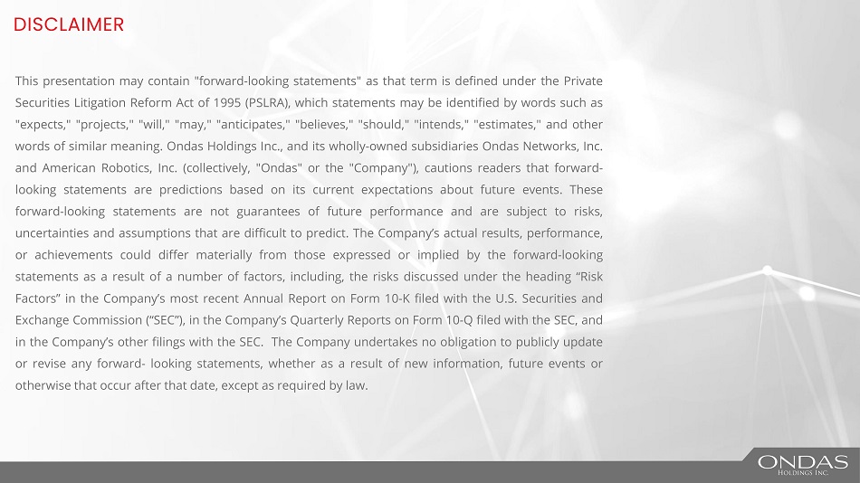 This presentation may contain "forward - looking statements" as that term is defined under the Private Securities Litigation Reform Act of 1995 (PSLRA), which statements may be identified by words such as "expects," "projects," "will," "may," "anticipates," "believes," "should," "intends," "estimates," and other words of similar meaning . Ondas Holdings Inc . , and its wholly - owned subsidiaries Ondas Networks, Inc . and American Robotics, Inc . (collectively, "Ondas" or the "Company"), cautions readers that forward - looking statements are predictions based on its current expectations about future events . These forward - looking statements are not guarantees of future performance and are subject to risks, uncertainties and assumptions that are difficult to predict . The Company’s actual results, performance, or achievements could differ materially from those expressed or implied by the forward - looking statements as a result of a number of factors, including, the risks discussed under the heading “Risk Factors” in the Company’s most recent Annual Report on Form 10 - K filed with the U . S . Securities and Exchange Commission (“SEC”), in the Company’s Quarterly Reports on Form 10 - Q filed with the SEC, and in the Company’s other filings with the SEC . The Company undertakes no obligation to publicly update or revise any forward - looking statements, whether as a result of new information, future events or otherwise that occur after that date, except as required by law . D I S C L A I M E R