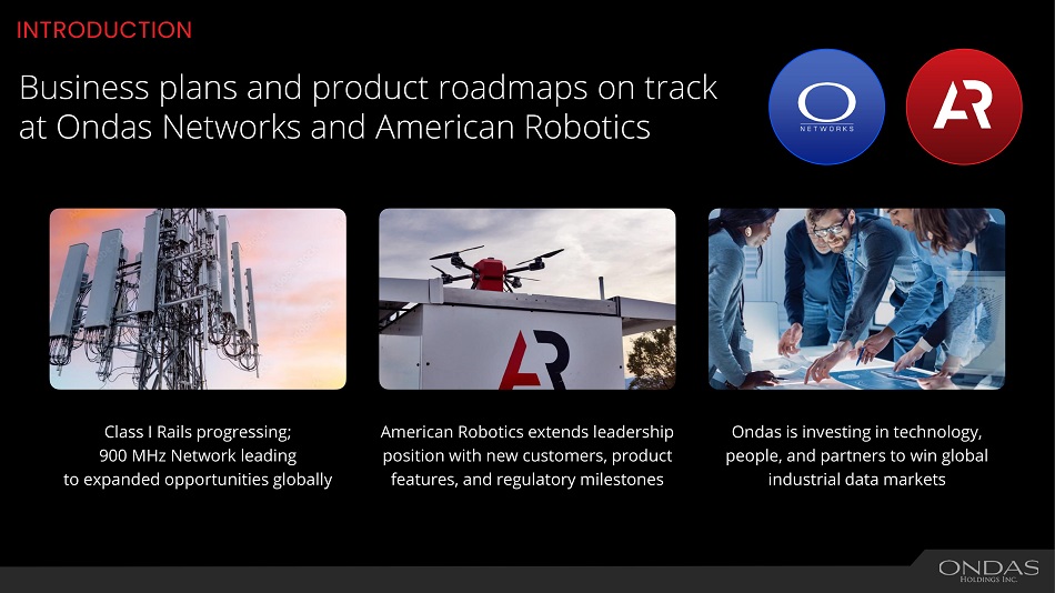 C l a ss I Ra i l s p r o g res s i ng; 90 0 MHz N e t w o r k l e a d i ng t o e x p a n de d o p p o rtun i tie s g l o b a l l y I N T R O D U C T I O N Business plans and product roadmaps on track at Ondas Networks and American Robotics A m eri c a n Ro b o ti c s e x tend s l e a d ers h i p p o s i ti o n with new c u s tomer s , p r o d u c t f eature s , a nd re g u l a tory mile s to n es O n d a s i s i n v est i ng i n tech n o l o g y, p e o p l e , a nd p a rtner s t o win g l o b a l i n d u str i a l d a ta mar k ets
