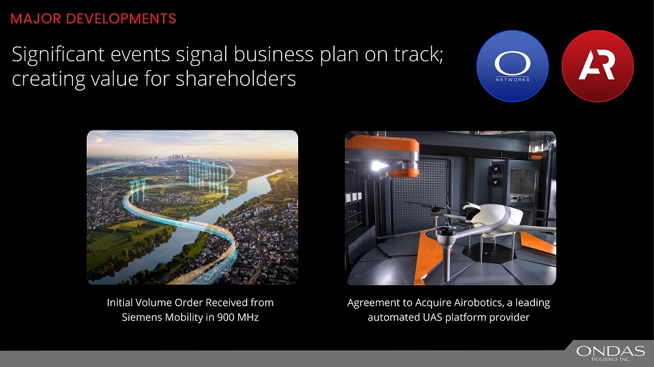 In i ti a l V o l u m e O rde r R e c ei v e d f r o m S i em e ns M o b ili t y i n 90 0 MHz MAJOR DEVELOPMENTS Significant events signal business plan on track; creating value for shareholders Ag ree m en t t o Ac q u i r e Air o b o ti c s , a l e a d i ng a ut o mate d UAS p l a t f o r m p r o v i d er