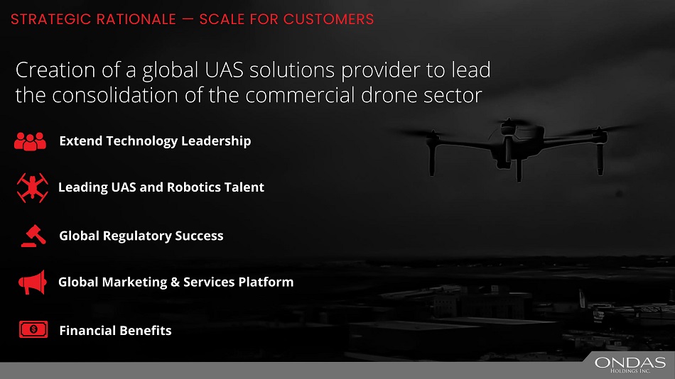 STRATEGIC RATIONALE — SCALE FOR CUSTOMERS Creation of a global UAS solutions provider to lead the consolidation of the commercial drone sector Extend Technology Leadership Leading UAS and Robotics Talent Global Regulatory Success Global Marketing & Services Platform Financial Benefits