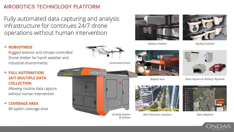 Robo t ic Arm Da t a C a p t ure & De l ivery P ay l o a d s B at t ery Ca b in e t P ay l o a d Ca b in e t Rea l - T i m e U s er In t er f ace Data P latf o rm AIROBOTICS TECHNOLOGY PLATFORM Fully automated data capturing and analysis infrastructure for continues 24/7 drone operations without human intervention + ROBUSTNESS Rugged exterior and climate - controlled Drone shelter for harsh weather and industrial environments + FULL AUTOMATION 24/7 MULTIPLE DATA COLLECTION Allowing routine data capture without human intervention + C O VERA G E AREA 80 sq/km coverage area D o c k ing S t a t i o n & Air b a s e Aut o ma t ed Dr o ne