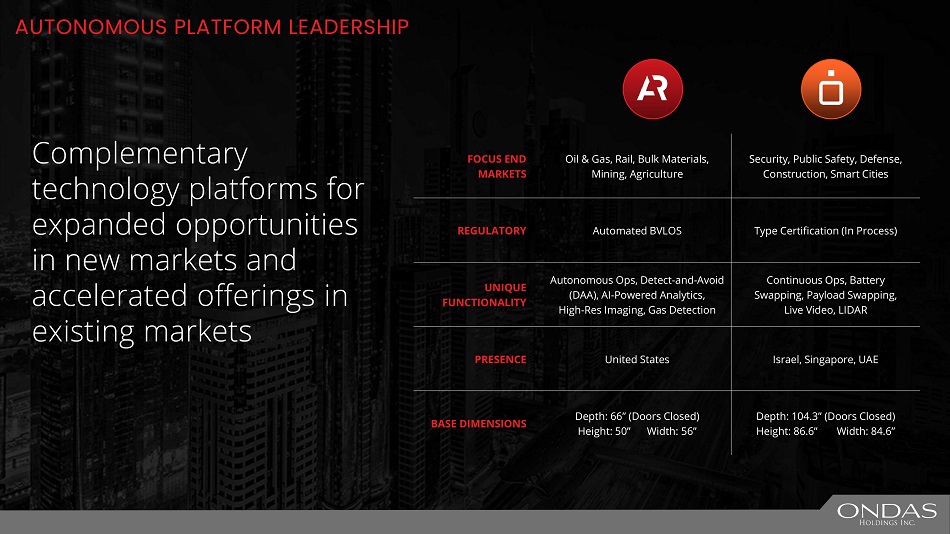 AUTONOMOUS PLATFORM LEADERSHIP Complementary technology platforms for expanded opportunities in new markets and accelerated offerings in existing markets F OC U S E N D MA R K E T S O il & Gas, R ai l , Bu l k M at e ria l s, M i n i n g, Agr i cult u re Se curit y , Publ i c S afet y , D e fens e , C onstruct i o n, S ma rt C i t i e s REGULATORY Automat e d B V LO S T y pe C e rtif i cati o n ( I n Proc e ss) UN IQ UE F UN CTIO N A L ITY Auto n om o us O ps, D e t e c t - an d - Av o id ( D A A ), A I - Po w e r e d Anal y t i cs, Hig h - Re s I magi n g, Ga s D e t e cti o n C ont i nuous O ps, Batt e ry S w app i n g , Pa yl oad S w app i n g , L i v e V id e o, LI DAR PRESENCE Un i t e d S tat e s I srae l , S i n gapor e , UAE BA S E DIM E N S IO NS D e pth: 66 ” (D o ors C l o s e d) H e i g ht: 50 ” W i dth: 5 6 ” D e pth: 104.3 ” (D o ors C l o s e d) H e i g ht: 86.6 ” W id t h: 84.6 ”