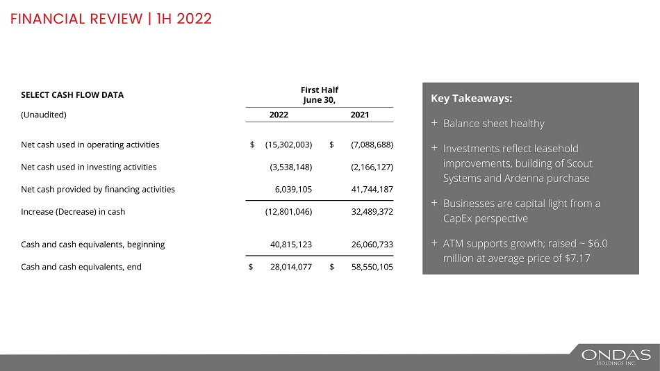 F I N A N C I A L RE V I E W | 1 H 2 0 2 2 Key Takeaways: + Balance sheet healthy + Investments reflect leasehold improvements, building of Scout Systems and Ardenna purchase + Businesses are capital light from a CapEx perspective + ATM supports growth; raised ~ $6.0 million at average price of $7.17 SE L E CT C ASH F L O W DATA F i r s t H a l f Ju n e 30, (Unaudited) 2022 2021 Net cash used in operating activities $ (15,302,003) $ (7,088,688) Net cash used in investing activities (3,538,148) (2,166,127) Net cash provided by financing activities 6,039,105 41,744,187 Increase (Decrease) in cash (12,801,046) 32,489,372 Cash and cash equivalents, beginning 40,815,123 26,060,733 Cash and cash equivalents, end $ 28,014,077 $ 58,550,105