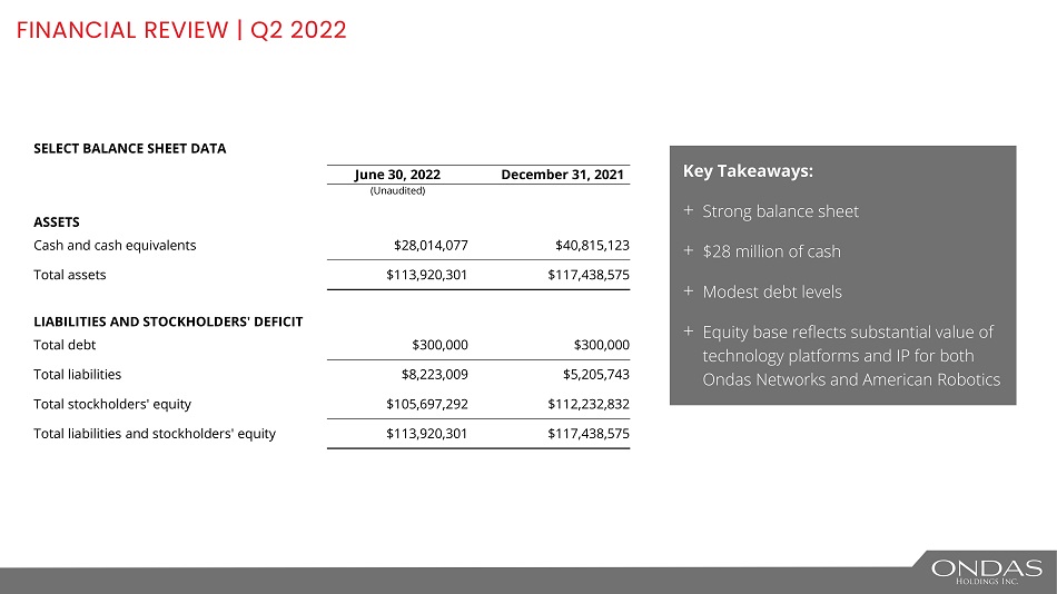 FINANCIAL REVIEW | Q2 2022 Key Takeaways: + Strong balance sheet + $28 million of cash + Modest debt levels + Equity base reflects substantial value of technology platforms and IP for both Ondas Networks and American Robotics SE L E CT BA L A N CE S H EE T DATA Ju n e 3 0 , 2022 De c e mb er 31, 2021 (Unaudited) ASSETS Cash and cash equivalents $28,014,077 $40,815,123 Total assets $113,920,301 $117,438,575 L IA B I L ITIE S A N D ST O C K HO L DERS ' DE F ICIT Total debt $300,000 $300,000 Total liabilities $8,223,009 $5,205,743 Total stockholders' equity $105,697,292 $112,232,832 Total liabilities and stockholders' equity $113,920,301 $117,438,575