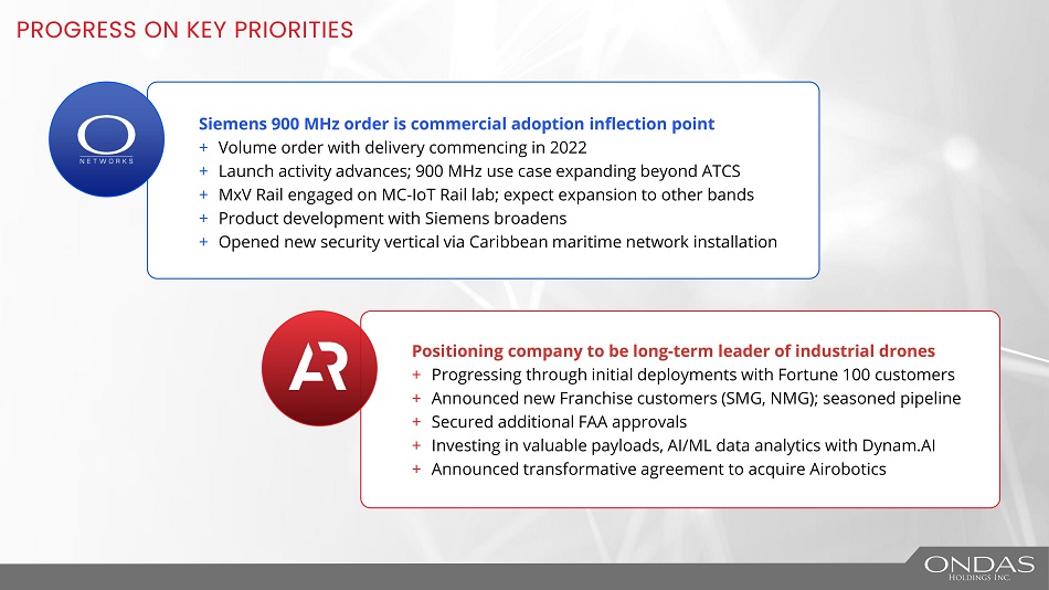 PROGRESS ON KEY PRIORITIES Siemens 900 MHz order is commercial adoption inflection point + V o l ume o rd er with del i v er y c o m m en c i ng i n 2 02 2 + Launch activity advances; 900 MHz use case expanding beyond ATCS + MxV Rail engaged on MC - IoT Rail lab; expect expansion to other bands + Product development with Siemens broadens + Opened new security vertical via Caribbean maritime network installation Positioning company to be long - term leader of industrial drones + Progressing through initial deployments with Fortune 100 customers + Announced new Franchise customers (SMG, NMG); seasoned pipeline + Se cured a dd i ti o n a l F AA a pp r o v a l s + In v est i ng i n v a l u a b l e p a y l o a d s , AI/ML d a ta a n a l yti c s with Dyn a m . AI + Announced transformative agreement to acquire Airobotics
