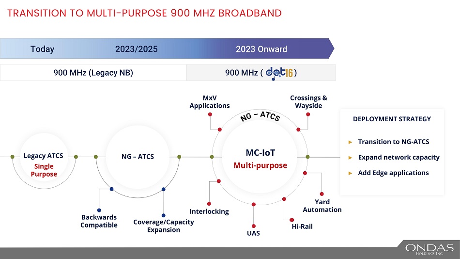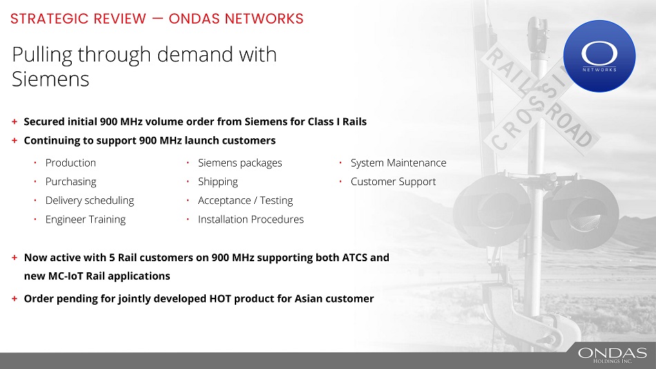 STRATEGIC REVIEW — ONDAS NETWORKS Pulling through demand with Siemens + Secured initial 900 MHz volume order from Siemens for Class I Rails + Continuing to support 900 MHz launch customers • System Maintenance • Customer Support + Now active with 5 Rail customers on 900 MHz supporting both ATCS and new MC - IoT Rail applications + Order pending for jointly developed HOT product for Asian customer • Siemens packages • Shipping • Acceptance / Testing • Installation Procedures • Production • Purchasing • Delivery scheduling • Engineer Training