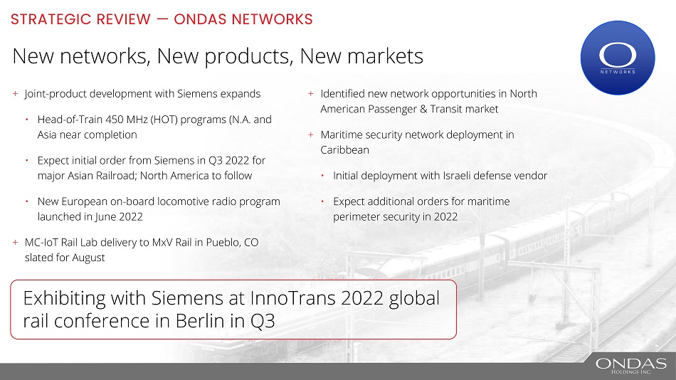STRATEGIC REVIEW — ONDAS NETWORKS New networks, New products, New markets + Joint - product development with Siemens expands • Head - of - Train 450 MHz (HOT) programs (N.A. and Asia near completion • Expect initial order from Siemens in Q3 2022 for major Asian Railroad; North America to follow • New European on - board locomotive radio program launched in June 2022 + MC - IoT Rail Lab delivery to MxV Rail in Pueblo, CO slated for August + Identified new network opportunities in North American Passenger & Transit market + Maritime security network deployment in Caribbean • Initial deployment with Israeli defense vendor • Expect additional orders for maritime perimeter security in 2022 Exhibiting with Siemens at InnoTrans 2022 global rail conference in Berlin in Q3