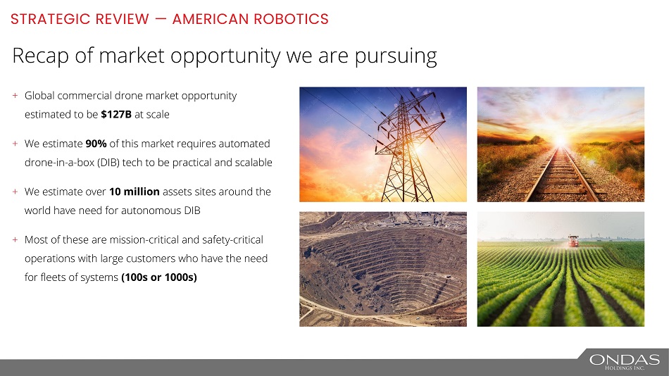 STRATEGIC REVIEW — AMERICAN ROBOTICS Recap of market opportunity we are pursuing + Global commercial drone market opportunity estimated to be $127B at scale + We estimate 90% of this market requires automated drone - in - a - box (DIB) tech to be practical and scalable + We estimate over 10 million assets sites around the world have need for autonomous DIB + Most of these are mission - critical and safety - critical operations with large customers who have the need for fleets of systems (100s or 1000s)