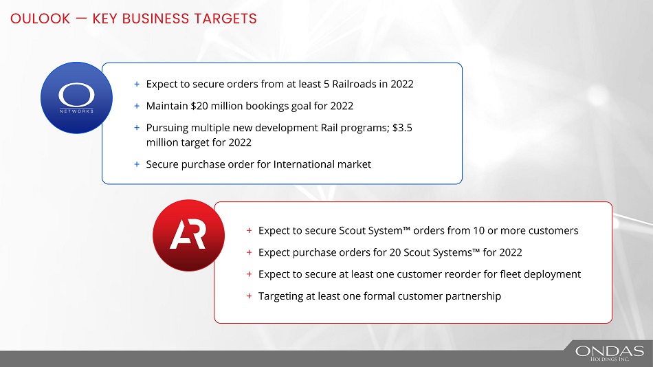 OULOOK — KEY BUSINESS TARGETS + E x p e c t t o se c ure o rd er s f r o m a t l e a s t 5 Ra i l r o a d s i n 2 02 2 + Maintain $20 million bookings goal for 2022 + Pursuing multiple new development Rail programs; $3.5 mi l li o n ta r g e t for 2 02 2 + Secure purchase order for International market + Expect to secure Scout System Œ orders from 10 or more customers + E x p e c t pur c h a s e o rd er s for 2 0 S c o ut S y s te m s Œ for 2 02 2 + Expect to secure at least one customer reorder for fleet deployment + Targeting at least one formal customer partnership