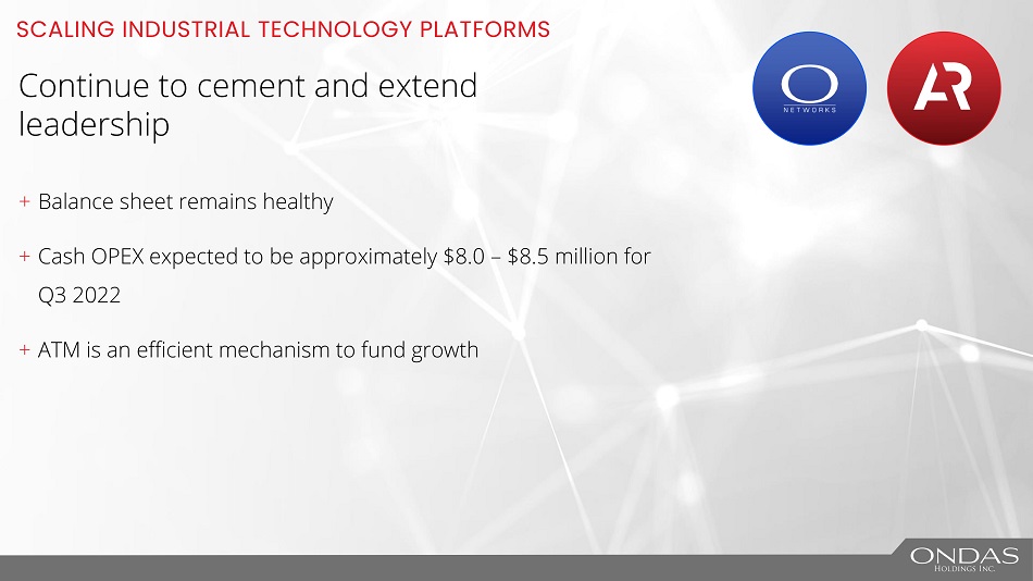 SCALING INDUSTRIAL TECHNOLOGY PLATFORMS + Balance sheet remains healthy + Cash OPEX expected to be approximately $8.0 – $8.5 million for Q3 2022 + ATM is an efficient mechanism to fund growth Continue to cement and extend leadership