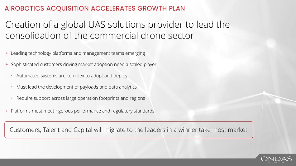 AIROBOTICS ACQUISITION ACCELERATES GROWTH PLAN Creation of a global UAS solutions provider to lead the consolidation of the commercial drone sector + Leading technology platforms and management teams emerging + Sophisticated customers driving market adoption need a scaled player • Automated systems are complex to adopt and deploy • Must lead the development of payloads and data analytics • Require support across large operation footprints and regions + Platforms must meet rigorous performance and regulatory standards Customers, Talent and Capital will migrate to the leaders in a winner take most market