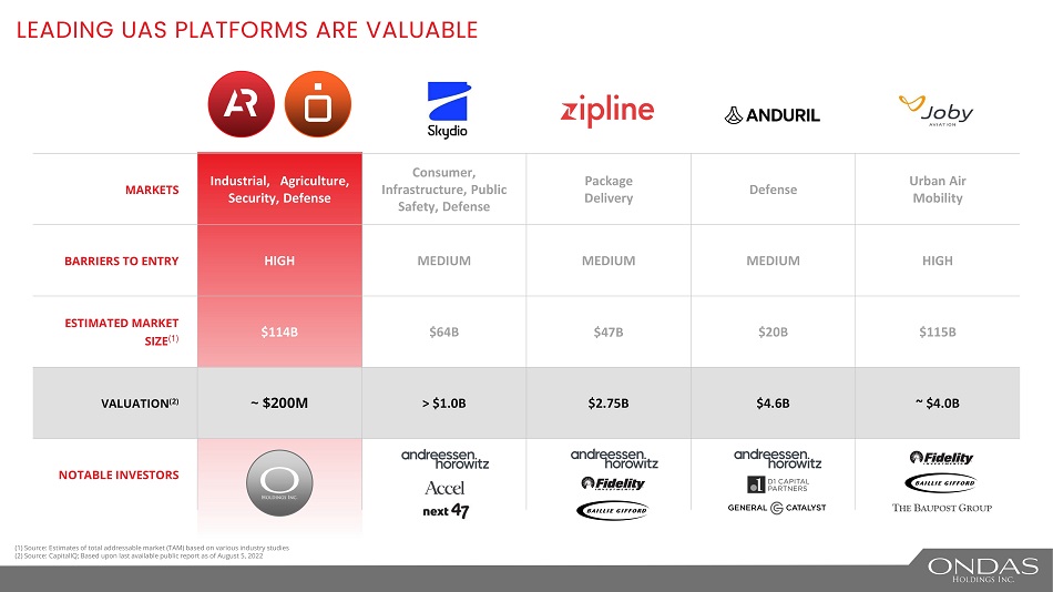 LEADING UAS PLATFORMS ARE VALUABLE MARKETS Indus tr i a l , A g r i cultu r e , Security, Defense Consumer, Infrastructure, Public Safety, Defense Pa ck a ge D e li v e r y Defense Urban Air Mobility BARRI E R S TO E N TRY HIGH MEDIUM MEDIUM MEDIUM HIGH E S TIMA T E D MA R K E T SIZE (1) $114B $64B $47B $20B $115B VALUATION (2) ~ $200M > $1.0B $2.75B $4.6B ~ $4.0B N OTABLE I N V E S TORS (1) Source: Estimates of total addressable market (TAM) based on various industry studies (2) Source: CapitalIQ; Based upon last available public report as of August 5, 2022
