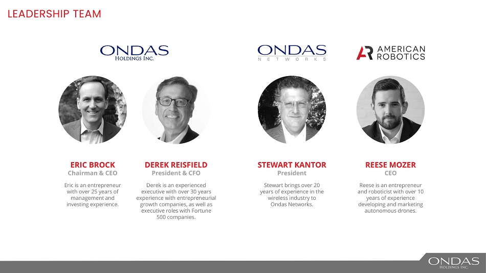 LEADERSHIP TEAM E R I C B R O C K Chairman & CEO Eric is a n e ntr e pren e ur w i t h ov e r 25 y e ar s of m a nagement and i nv e st i ng e xp e ri e nc e . D E R E K R E I S F I E LD Chairman & CFO D e r e k is a n e xpe ri e nc e d e x e c u tive w ith ov e r 30 y e a r s e xpe ri e nce w i t h e ntr e pren eurial gro w t h com p ani e s , a s w e l l as e x e c u tive rol e s w ith F ortun e 50 0 com p ani e s. STEW A R T KANT O R President S t e w ar t brin g s ov e r 20 y e ar s of e xpe ri e nce in the w ir e l e s s i n dustry to O ndas N e t w or k s. REES E M O Z ER CEO R ee se is a n e ntr e pren e ur an d robot i cis t w i t h ov e r 1 0 y e ar s of e xpe ri e nce d e v e l op i ng and mark e ting auton o mo u s dron e s.