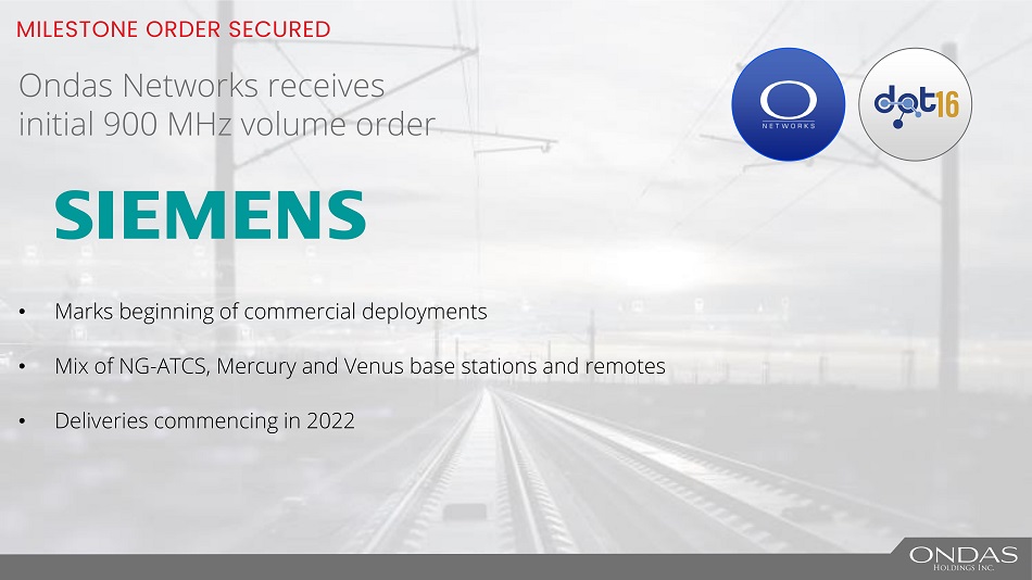 MILESTONE ORDER SECURED • Marks beginning of commercial deployments • Mix of N G - A T CS , Mercury a nd V e n us b a se statio n s a nd remotes • Deliveries commencing in 2022 Ondas Networks receives initial 900 MHz volume order