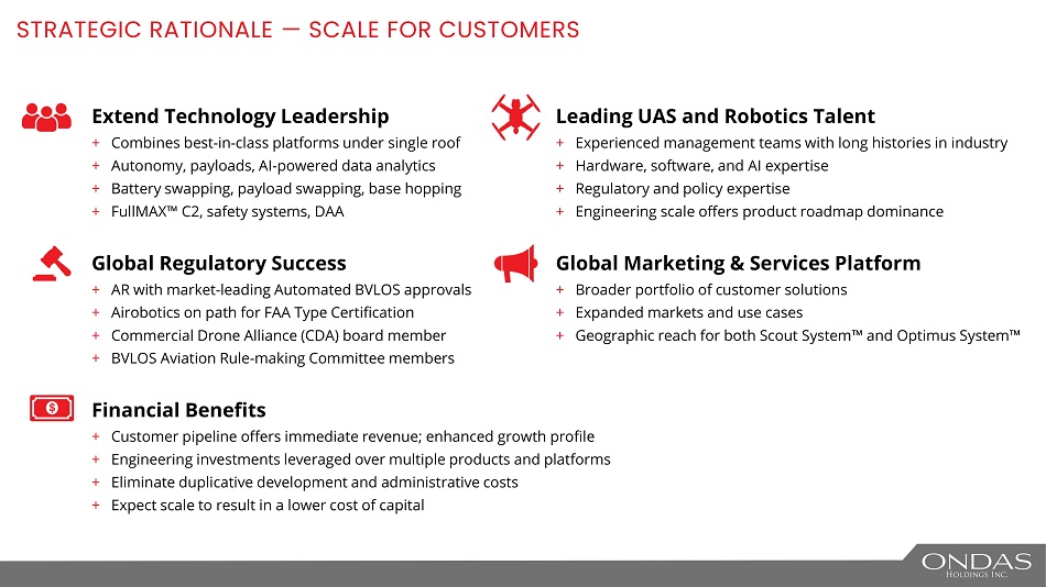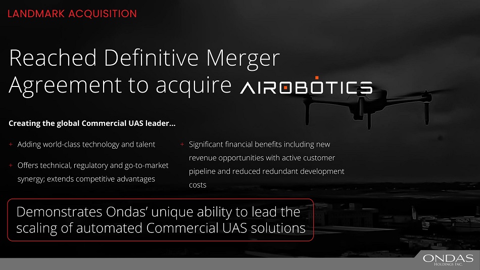 LANDMARK ACQUISITION Creating the global Commercial UAS leader… + Adding world - class technology and talent + Offers technical, regulatory and go - to - market synergy; extends competitive advantages + Significant financial benefits including new revenue opportunities with active customer pipeline and reduced redundant development costs Reached Definitive Merger Agreement to acquire Demonstrates Ondas’ unique ability to lead the scaling of automated Commercial UAS solutions