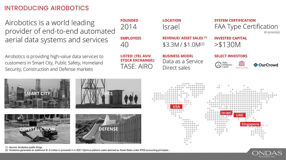 INTRODUCING AIROBOTICS Airobotics is a world leading provider of end - to - end automated aerial data systems and services Airobotics is providing high - value data services to customers in Smart City, Public Safety, Homeland Security, Construction and Defense markets FOUNDED 2014 EMPLOYEES 40 LISTED: (TEL AVIV ST O C K E X C H A N GE): TA S E: AIRO LOCATION Israel REVE N U E / ASSET SAL E S ( 1 ) $3.3M/ $1.0M (2) BUSINESS MODEL Data as a Service Direct sales SYSTEM CERTIFICATION FAA Type Cer t if i cat i on (in process) INVESTED CAPITAL >$130M SEL E C T I N VEST O RS SMART CITY CONSTRUCTION DEFENSE HLS USA Israel UAE Singapore (1) Source: Airobotics public filings. (2) Airobotics generated an additional $1.0 million in proceeds in in 2021 Optimus platform sales deemed as Asset Sales under IFRS accounting principles..