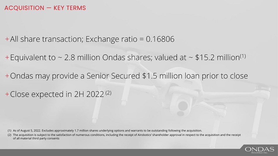 ACQUISITION — KEY TERMS + All share transaction; Exchange ratio = 0.16806 + Equivalent to ~ 2.8 million Ondas shares; valued at ~ $15.2 million (1) + Ondas may provide a Senior Secured $1.5 million loan prior to close + Clo s e exp e ct e d i n 2H 2 0 22 ( 2 ) (1) As of August 5, 2022. Excludes approximately 1.7 million shares underlying options and warrants to be outstanding following the acquisition. (2) The acquisition is subject to the satisfaction of numerous conditions, including the receipt of Airobotics’ shareholder approval in respect to the acquisition and the receipt of all material third party consents