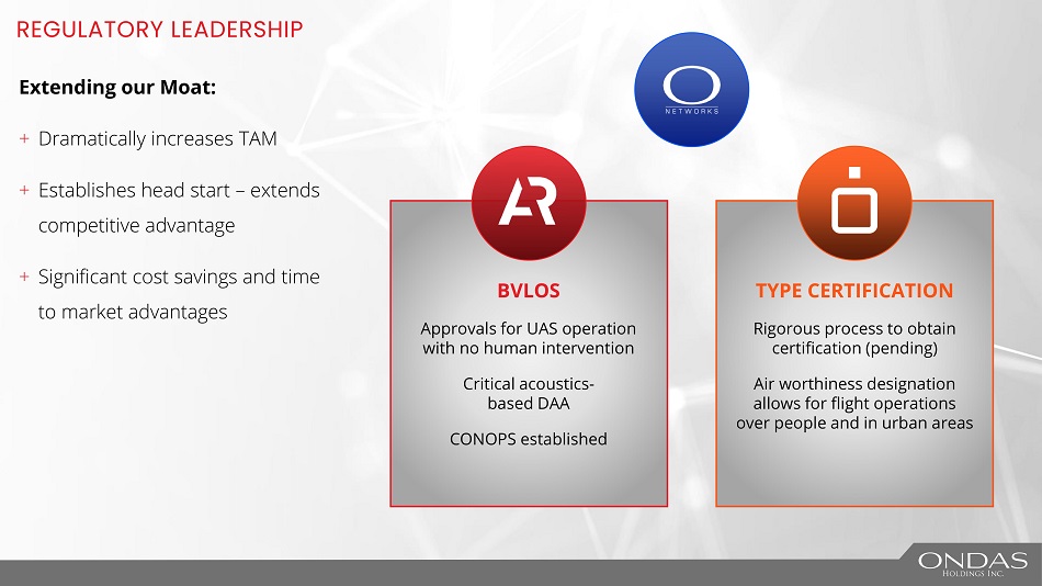 REGULATORY LEADERSHIP Extending our Moat: + Dramatically increases TAM + Establishes head start – extends competitive advantage + Significant cost savings and time to market advantages BVLOS Ap p r o v a l s for U AS o p er a ti o n with no human intervention Cr i ti c a l a c o u s ti c s - b a s e d DAA CONOPS established TYPE C ERTIFI C A TION Ri g or o us p r o c es s t o o b ta i n c ertifi c a ti o n ( p en d ing) Air w o rth ine s s d es i g n a ti o n a ll o ws for fli g ht o p er a ti o ns o v er p e o p l e a nd in ur b a n a reas