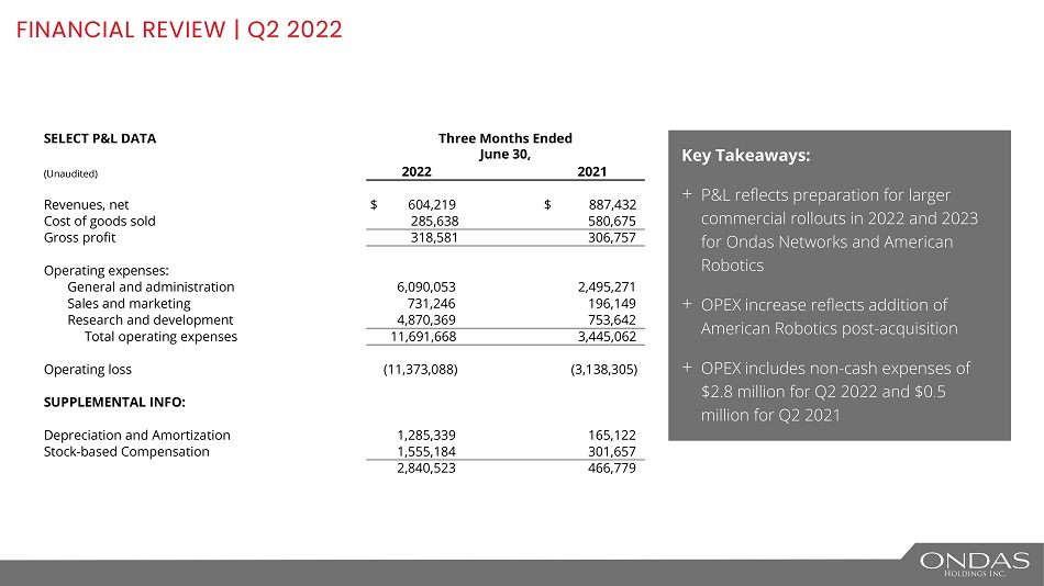 FINANCIAL REVIEW | Q2 2022 Key Takeaways: + P&L reflects preparation for larger commercial rollouts in 2022 and 2023 for Ondas Networks and American Robotics + O PEX inc r e as e r e f lect s a d d iti o n of American Robotics post - acquisition + O PEX inc lu d es no n - c a sh expe n ses of $2.8 million for Q2 2022 and $0.5 million for Q2 2021 SE L E CT P&L DATA Three Months Ended June 30, (Unaudited) 2022 2021 Revenues, net $ 604,219 $ 887,432 Cost of goods sold 285,638 580,675 Gross profit 318,581 306,757 Operating expenses: General and administration 6,090,053 2,495,271 Sales and marketing 731,246 196,149 Research and development 4,870,369 753,642 Total operating expenses 11,691,668 3,445,062 Operating loss (11,373,088) (3,138,305) SUPPLEMENTAL INFO: Depreciation and Amortization 1,285,339 165,122 Stock - based Compensation 1,555,184 301,657 2,840,523 466,779